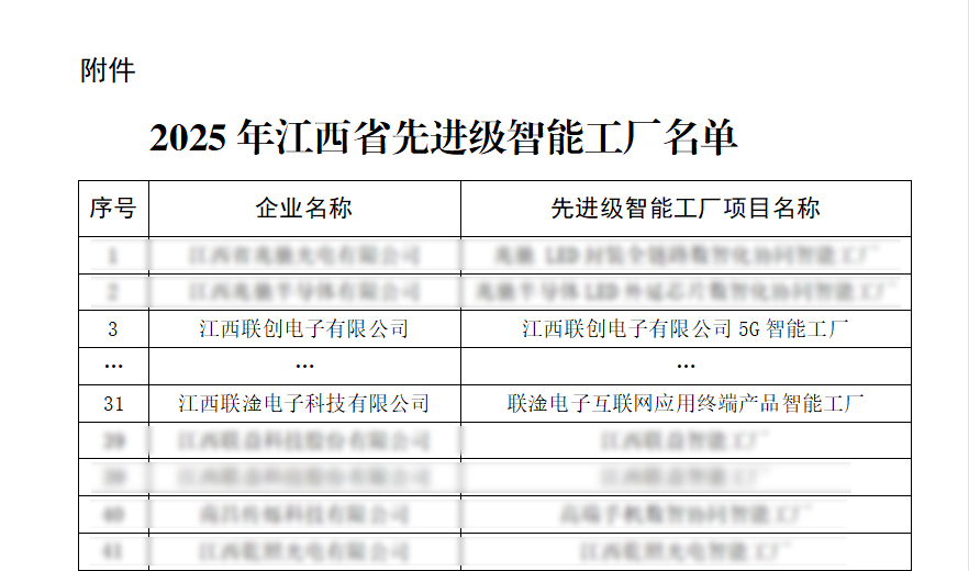 近日,江西省工业和信息化厅正式公布2025年江西省“先进级智能工厂”名单,186家企业入选。其中QS球速「中国」官方网站,、江西联淦电子科技有限公司2家联创电子系企业名列榜单。这标志着公司在智能制造领域的创新成果再次获得政府权威认可。